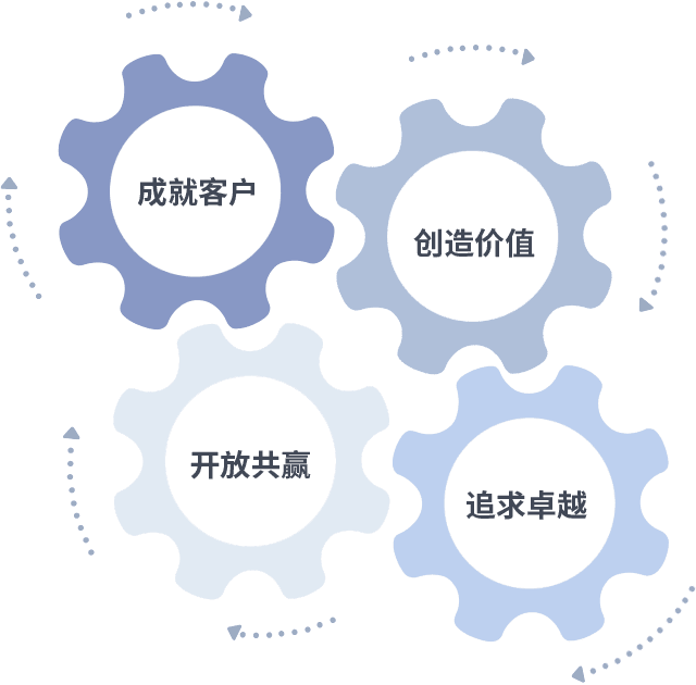 成就客户是一切决策的出发点,,,,创造价值是衡量所有工作的标准,,追求卓越是我们做事做人的态度,,开放共赢是我们的格局也是最终的结果。。价值观的齿轮环环相扣,,,,推动着组织里的每个人不断向前。。。